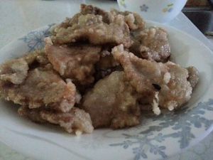 猪肉切3厘米厚片,淀粉调成淀粉糊。将肉沾满淀粉糊待油5成热时下锅进行初炸