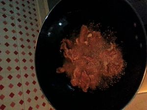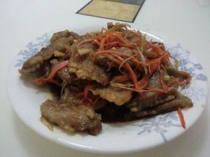 炸好后捞出。锅底留少量油下切好的配料,翻炒后调入配好的汁,然后倒入炸好的肉翻炒出锅。