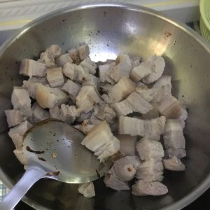 冰糖炒制黑褐色后放入煮好的肉(切块后冷水下锅,去掉浮沫,煮到透亮便可)