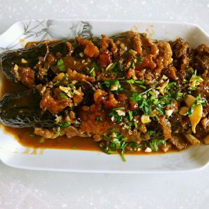 大约20分钟,收汁,先把茄子盛出来,汤汁加入香菜末蒜末后倒到茄子上~