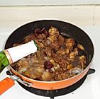 将鸭块与配料炒匀,加入酱油,翻炒,鸭块完全上色,加入白糖,炒匀。