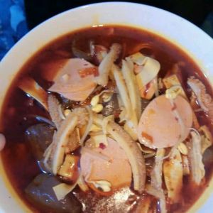 水烧开后放牛肚和鸭血一起煮几分钟,再放入豆皮和火腿,放盐 鸡精 再烧开就好啦。