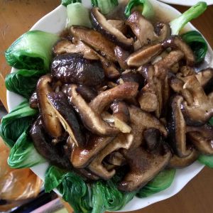 放油,倒香菇,放老抽2勺,耗油一大勺,放淀粉水,加点盐一点点,再炒几下,出锅