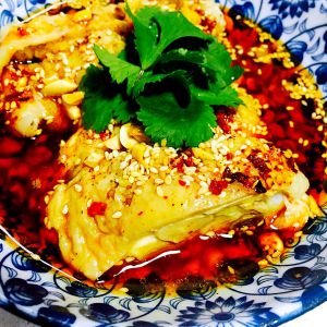 切盘,撒上花生碎,芝麻,淋上酱汁红油,摆上香菜,完美