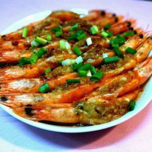 最后锅中倒入一茶勺花生油,油开后倒入一茶勺生抽,稍微翻炒后浇在整盘虾上。撒上少许葱花,美味的蒜蓉粉丝蒸虾就完成了。