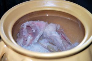 然后温水下锅,放入姜片、适量料酒(去除血腥味)煮开后撇干净浮沫。然后放入葱段、倒入少量的醋(可以使骨头中的钙质充分的炖出来)盖盖文火炖煮2小时。
