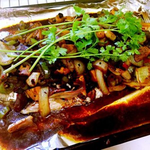 烤鱼的时候,开始做菜。炒锅放入底油,把准备好的蔬菜炒一下,我用的是青椒,香菇,洋葱。把豆豉放入,添250毫升水,煮3-5分钟。豉汁的香味就煮出来了。加一勺郫县豆瓣酱。咸度要重一些,这样鱼有味道。当然这个铺菜可以自己发挥的啊,喜欢辣的就大把加辣椒吧!把菜铺在鱼身上,烤箱降至180度,十分钟。出炉放香菜,
