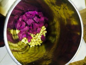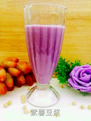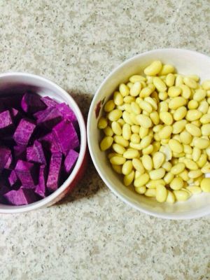 将黄豆和紫薯放在豆浆机里,加水到中水位,不要超过高水位。