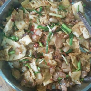 放入煎粑粑,翻炒均匀,加入盐,蒜苗调好味,起锅装盘。