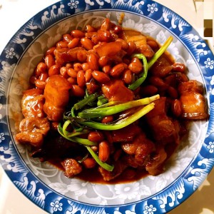 五花肉放入空炸机200度10分钟(可以放锅内煎炸代替,也可以油炸,相对来说空炸机去油脂比较好)。花生带浸泡的水放入砂锅,烧开后小火焖10分钟,倒去番茄酱,生抽,老抽,料酒,八角桂皮,搅拌均匀倒入炸锅里的五花肉,不怕胖的可以连锅内炸出来的肉油一起倒入,怕胖的可以改加橄榄油两汤匙代替。小火焖五分钟,放入少量盐,葱段,大火收汁即可。