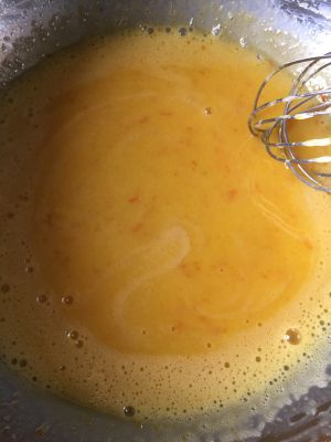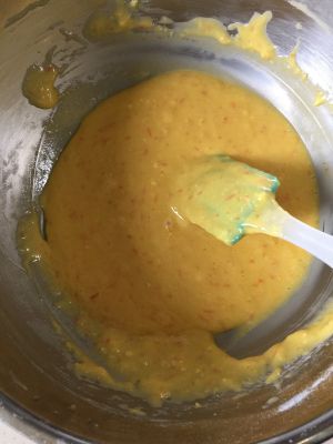 蛋黄加入蜂蜜搅拌匀,再加入橙皮和橙汁搅拌匀,加入玉米油35克!