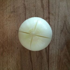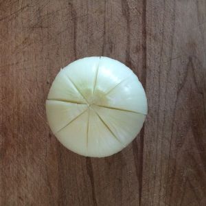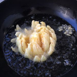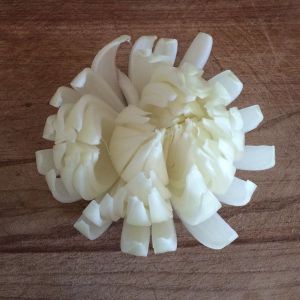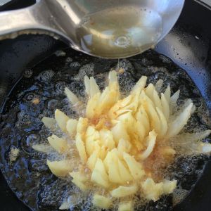 中途将热油淋在洋葱花上,让花瓣舒展开