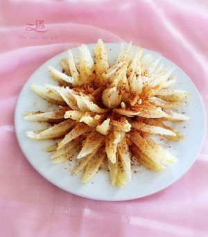 根据自己的口味撒上孜然粉、辣椒粉就可以上桌了,随盘放番茄沙司、沙拉酱各一份