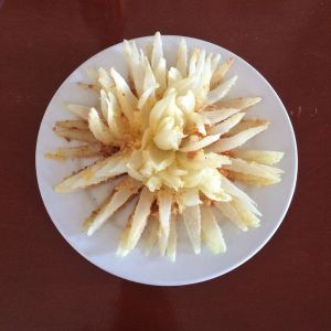 将炸好的洋葱花放入盘中,已经像一朵莲花了
