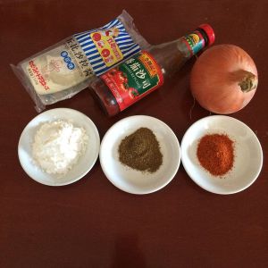 准备食材:洋葱、淀粉、辣椒粉、孜然粉、丘比沙拉酱、番茄沙司