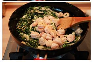 放入适量盐、鸡精后加入虾仁一起翻炒至完全成熟;