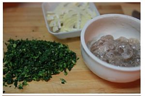 春笋切薄片;荠菜彻底挤干水分后切成碎末;