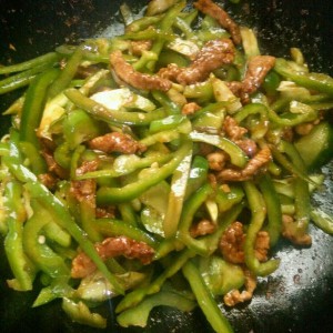 用中火,油温热加入葱蒜,肉丝,待肉丝稍稍变色翻炒两下,倒入适量海天特级一品鲜酱油,继续翻炒