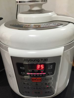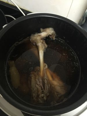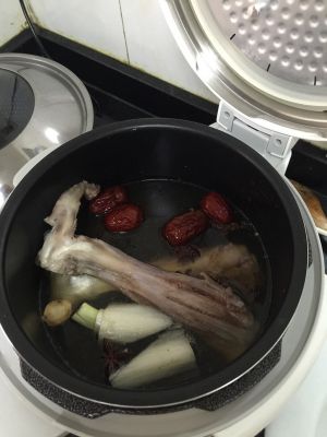将去血水的羊腿和汤水,以及准备好的辅料,全部倒入压力锅。