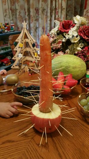 把胡萝卜用牙签固定在苹果底座上,再叉满牙签。
