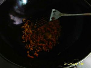 起油锅,放入葱姜滑入开洋翻炒,加入适量料酒同炒。
