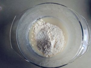 加入25克蛋液、5克水、50克炼奶,30克白砂糖和3克盐