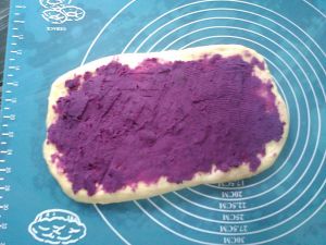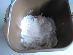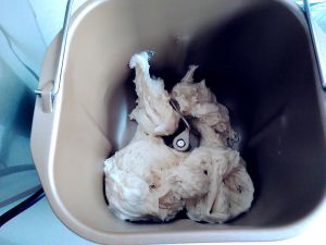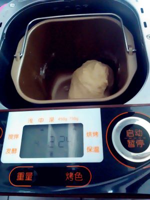 加入高筋面粉45克和低筋面粉50克。选择东菱面包机的和面程序,和面7分钟。再选择甜面包程序,