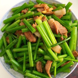 倒入芹菜翻炒,并倒入酱油和少量水,加盐拌匀出锅