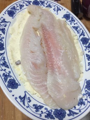 将土豆泥铺一层在烤盘底,将鱼排放在豆泥上,然后将剩下的豆泥铺在上面。