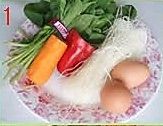 粉丝按说明浸泡至软,胡萝卜、红甜椒切丝;