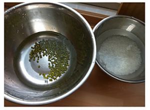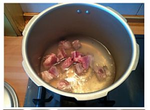 高压锅中放入排骨和绿豆及略微没过排骨的水及拍扁的生姜和打结的葱段,多放一些盐,盖紧锅盖,大火烧开转小火继续10分钟;
