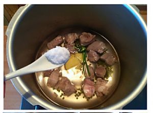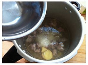 最后等高压锅排汽完毕打开锅盖,放入切成细丝的青菜,调入适量盐及鸡精即可。