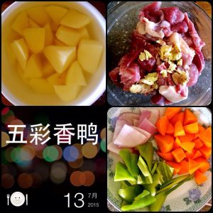 鸭肉切小块,葱白切段,小米椒切碎,姜拍碎,蒜切碎,洋葱一部分切碎,一部分切片,土豆滚刀切小块,胡罗卜滚刀切小块,青椒滚刀切片。把蒜粒,葱白,姜粒,洋葱粒放入切好的鸭肉里再放白酒,南乳汁,盐,生抽,油,淀粉,白糖,胡椒粉腌15分钟。