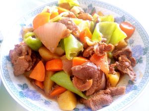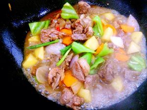 煸炒片刻的鸭里放胡罗卜,土豆,翻炒至土豆变色后放入洋葱片继续翻炒。然后放一勺盐和适量蚝油颠几下锅沿着锅边放水末过鸭肉,盖上锅盖大火焖3分钟后转小火焖5分钟,