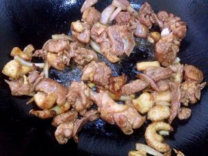热锅,放少量油放一点姜呛下锅把腌好的鸭肉放入锅内爆炒片刻,放一勺生抽,小米椒,白酒,翻炒片刻。