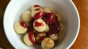 糯米粉加少许水和成面团,搓成汤圆大小球,放冰箱冻硬。