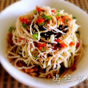 浇头可依次放入鸡丝、红米椒、葱花碎、炒熟的花生黄豆碎、红油、豆䜴豆瓣酱,洒熟芝麻。