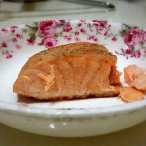 在烤盘上滴一小勺油,将腌好的三文鱼放在油上面。200°C 15min,烤的时候莫名有一种烧焦的味道,我还以为烤糊了!