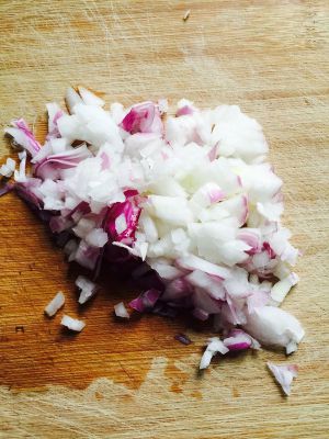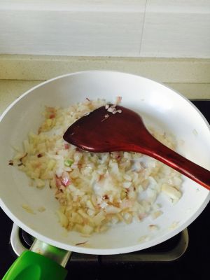 把切碎的洋葱放锅内用少量油拌一下,炒一下