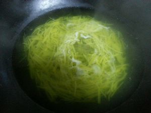 再把刨好的皮切成细丝(越细越好)放盐水里浸泡一个小时(这个步骤和下一个步骤是为了去除苦味)
