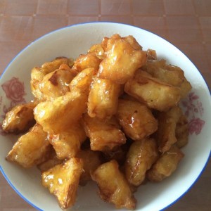 锅里留少许炸地瓜的油,放入比油多十五倍的糖,一定要少油多糖,糖炒成黄色倒入地瓜快速翻炒