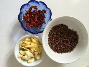 生姜切条,蒜瓣按碎,辣椒切段,花椒备用