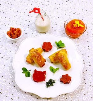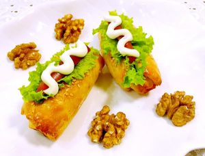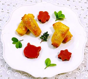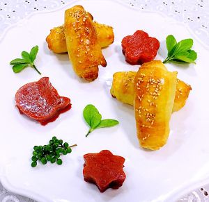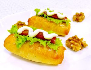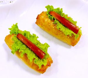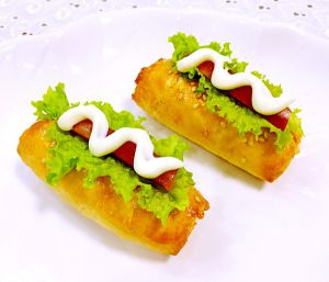 再上面淋上少许沙拉酱可爱的迷你热狗面包就大功告成了!