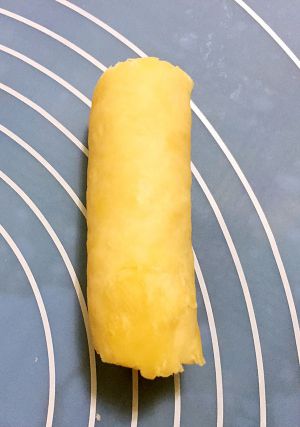 ,擀好的面团从上往下卷起,卷成一个圆柱体