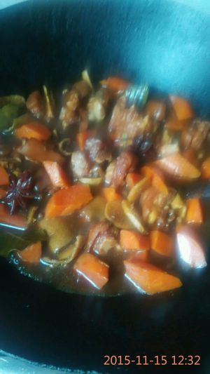 香叶,大料,老抽,生抽,料酒,适量,想放土豆和胡罗卜都可,高压锅炖煮,汁可收可不收,炖软放盐。肥而不腻。