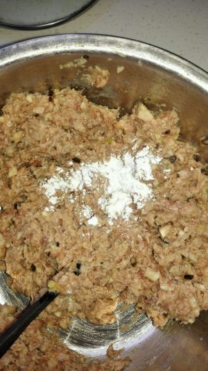 搅拌好的肉馅继续加入适量玉米淀粉,再继续一个方向搅拌,让肉馅上劲儿。