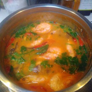 加水煮开(不需要加入高汤,因为食材的味道已经很鲜美了,根据人份加入水的分量),煮开后加入椰汁(椰汁分量不用太多,为了平衡辣和酸的味道),转小火炖15分钟左右。