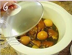 冷水放入洗净的鸡蛋煮熟,捞出敲破外壳,将鸡蛋和姜醋汁、猪脚一起放入慢炖锅,中火慢炖4小时左右即可食用,浸泡过夜味道更佳(姜也可食用)。