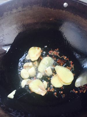 锅中油烧七成热,加入生姜片、蒜子、花椒、八角、尖椒炒香。