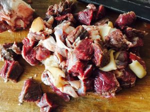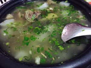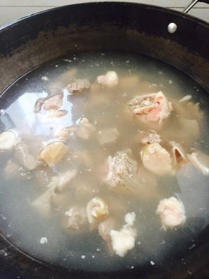 倒入羊肉翻炒片刻,加料酒继续炒干水气,加清水大火烧开。